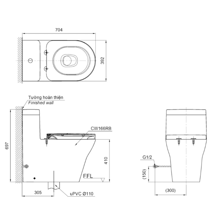 Bản vẽ kích thước bồn cầu TOTO điện tử CW166 nắp TCF33320GAA