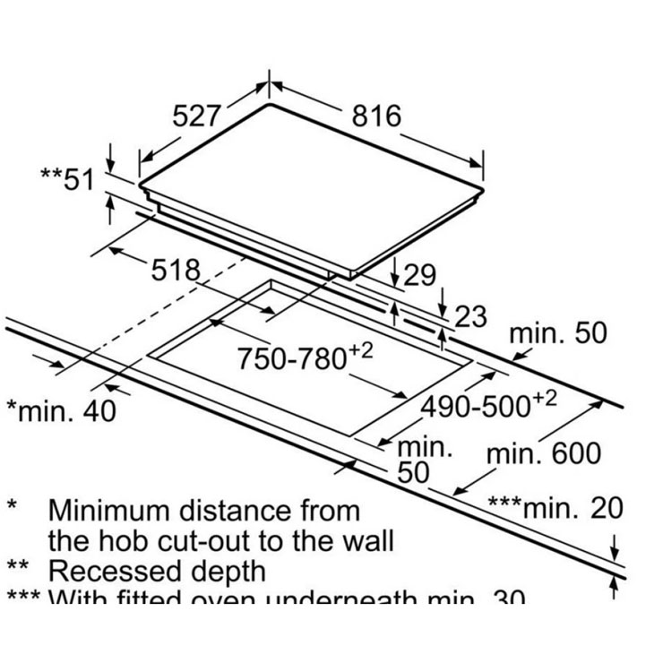- Kích thước lắp đặt (C x R x S) 51 x 750 x (490 – 500) mm