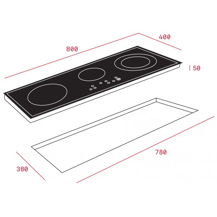 - 03 mặt bếp nấu: 1 bếp có vòng nhiệt 190/300mm Ø (2.500 – 3.700W); 1 bếp có vòng nhiệt 210mm Ø (2.100W); 1 bếp có vòng nhiệt 145mm Ø (1.800W).