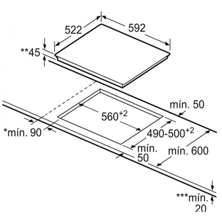 - Kích thước hộc bếp: 560-562R x 490-502S x 59C mm