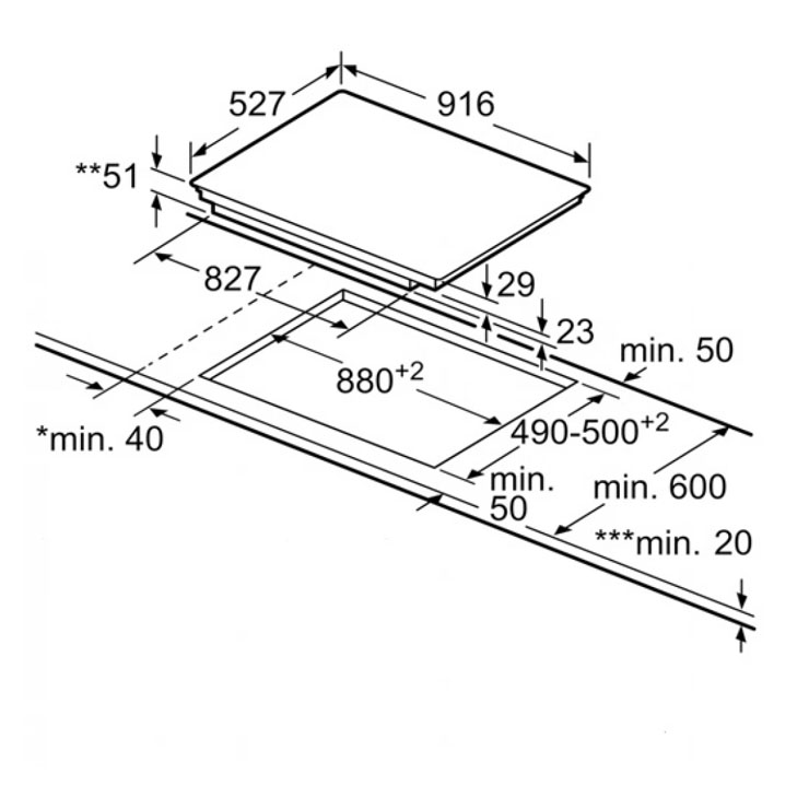 - Kích thước hộc bếp: 880-882R x 490-502S x 59C mm