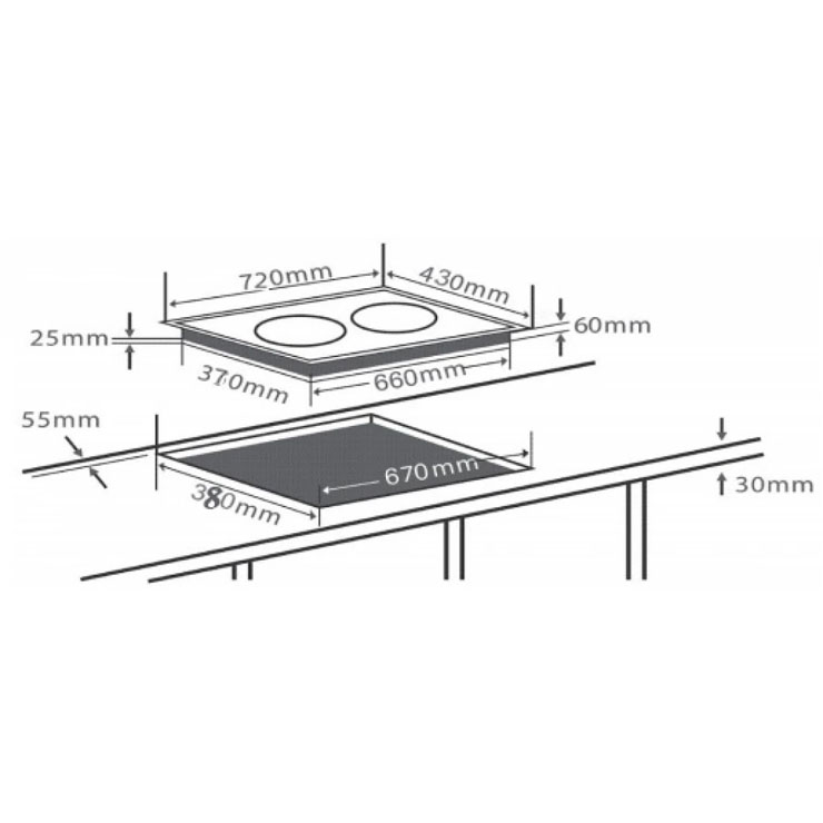 - Kích thước khoét lỗ: 670 x 380 mm