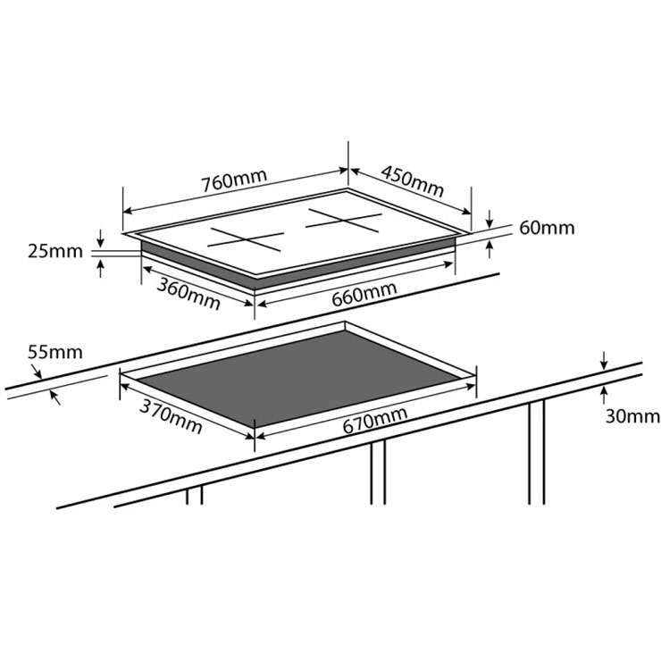 - Kích thước khoét lỗ: 670 x 370mm