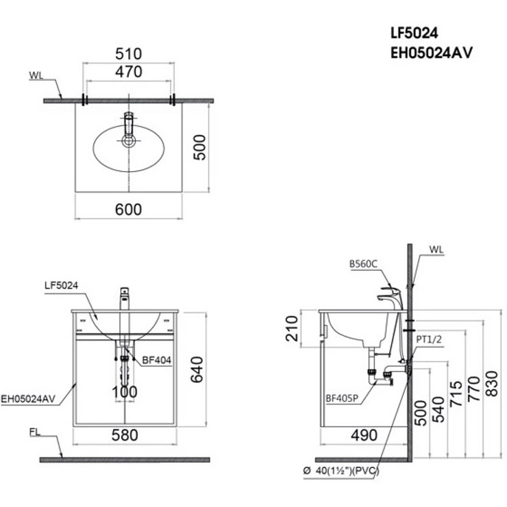 Bản vẽ tủ chậu rửa mặt LF5024+EH05024AV treo tường