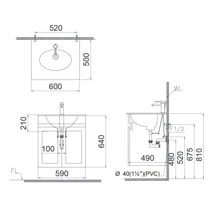 - Kích thước lavabo: 500 x 600 x 210 mm (dài x rộng x cao)