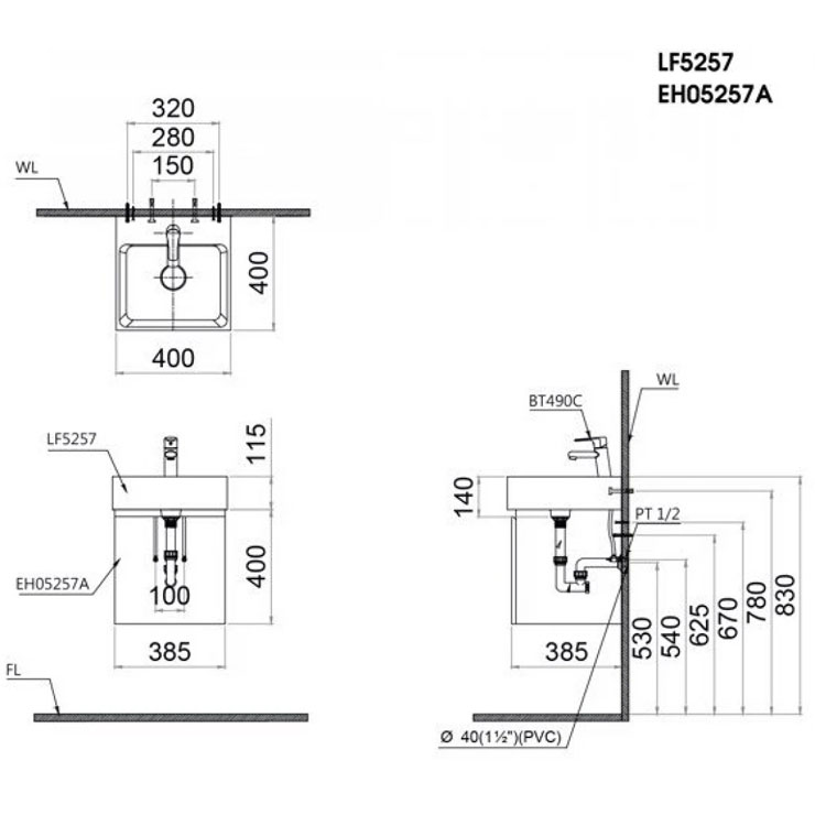 - Kích thước lavabo LF5257 : 400 x 400 x 115 mm (rộng x dài x cao)