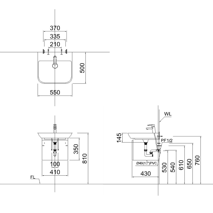 - Kích thước lavabo LF5370: 500 x 550 x 100 mm dài x rộng x cao)
