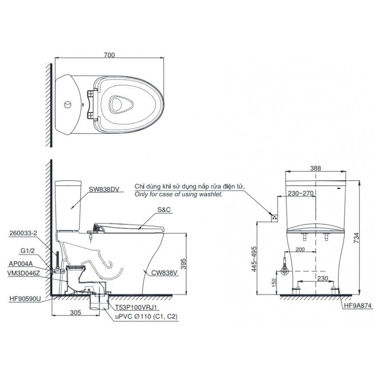 - Phù hợp lắp đặt với nắp rửa điện tử WASHLET (tùy chọn)