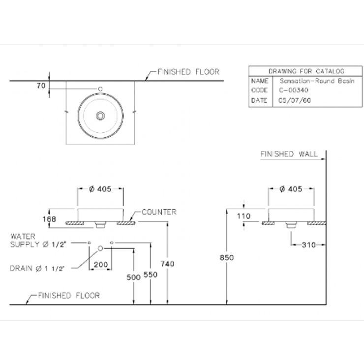 Bản vẽ kỹ thuật chậu lavabo trắng mờ C00340 MWH Cotto