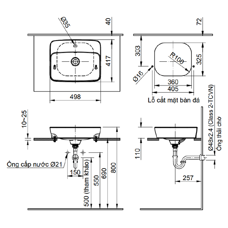 - Đường kính ống thải chờ Ø48