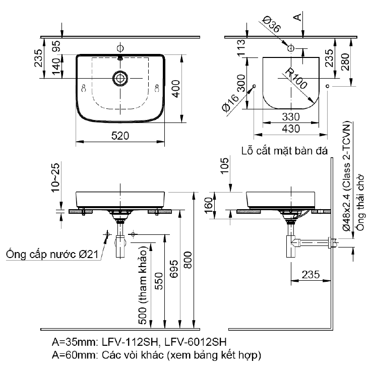 - Khi kết hợp với vòi chậu LFV-112SH, LFV-6012SH kích thước A = 35mm