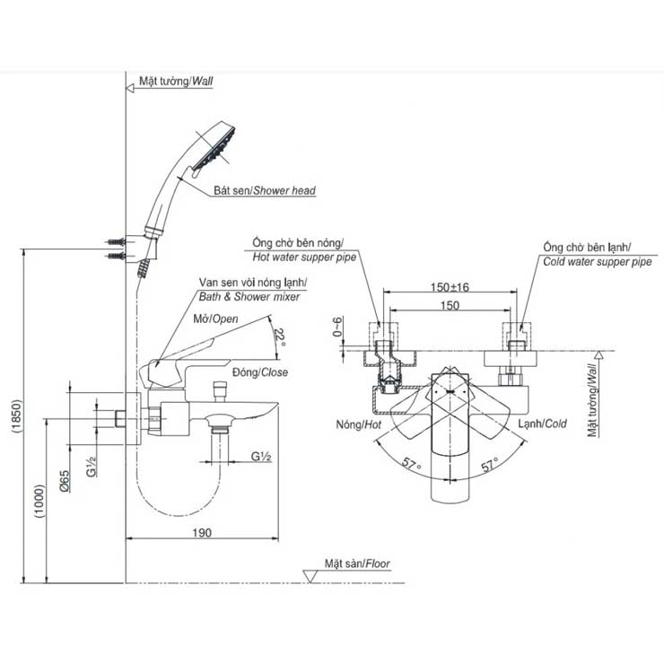 - Áp lực nước 0.05MPa ~ 0.75MPa