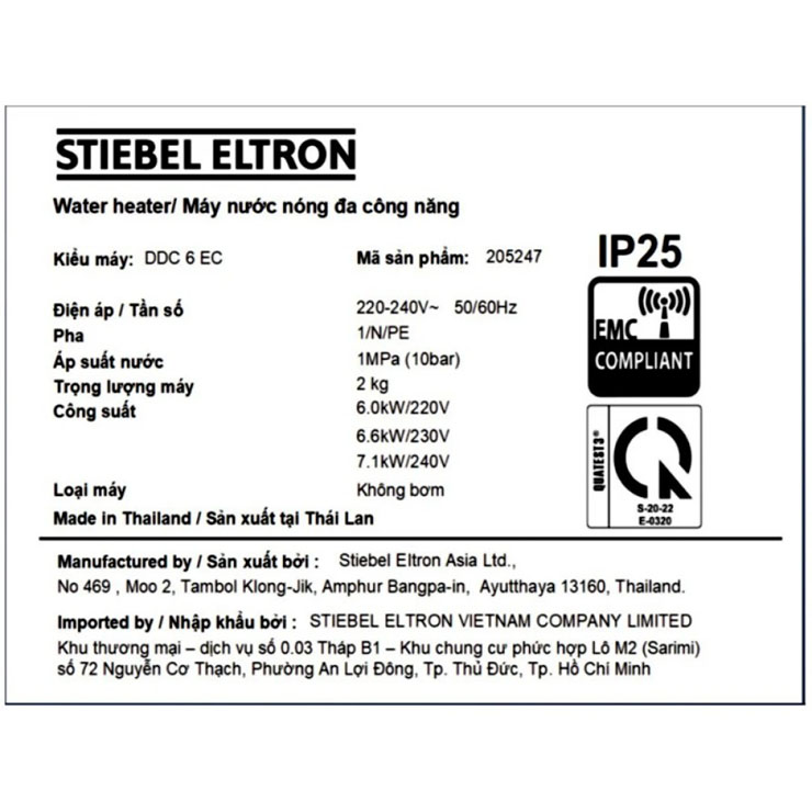 Thông số máy nước nóng đa điểm Stiebel Eltron DDC 6 EC (VN)