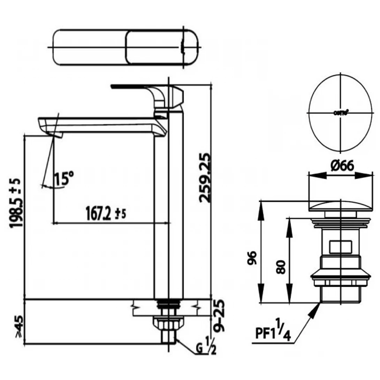Bản vẽ kích thước vòi lạnh Cotto ct 1143 ay gr