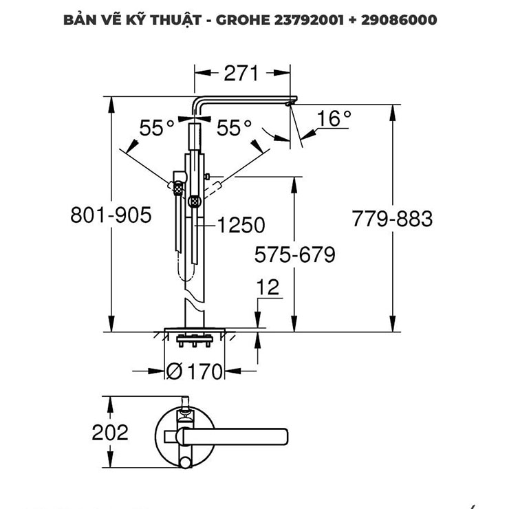 Bản vẽ vòi xả bồn tắm Grohe 23792001 đặt sàn